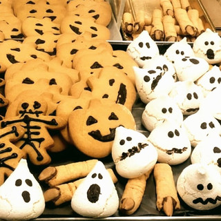 Halloween, benchè abbia origini lontane è diventata anche qui una festa importante per grandi e piccini. Potevamo noi del forno "Scuola di Pane" non celebrarla a modo nostro? E, allora ecco i fantasmi di meringa, fatti e dipinti a mano; ecco le zucche decorate con cioccolata e pistacchi. Gli scheletrini graziosi e con le ossa decorate a mano, non fanno paura, anzi sono tutto tranne che spaventosi. Sono di pastafrolla e cioccolato fondente, da mangiare in un sol boccone!! Il must, però, sono le dita: brutte, storte, sporche di cioccolato, e questa è cosa positivissima perché, quando le metti in bocca, Lui, il cioccolato, si scioglie e avvolge con dolcezza la mandorla tostata che funge da unghiona da stregona!!